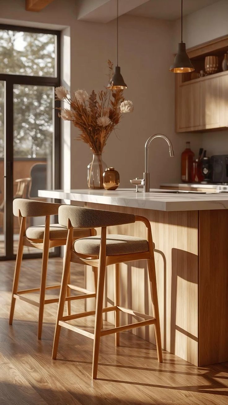 เฟอร์นิเจอร์ที่มีดีไซน์โปร่งเบา บ่งบอกความเป็น Mid-Century ที่ชัดเจน เช่น เก้าอี้สตูลบาร์โครงสร้างเพรียวบาง หรือโต๊ะรับประทานอาหารที่เน้นความโค้งมน สามารถใช้งานในครัวไทยได้ ช่วยให้พื้นที่ดูไม่ทึบเกินไป