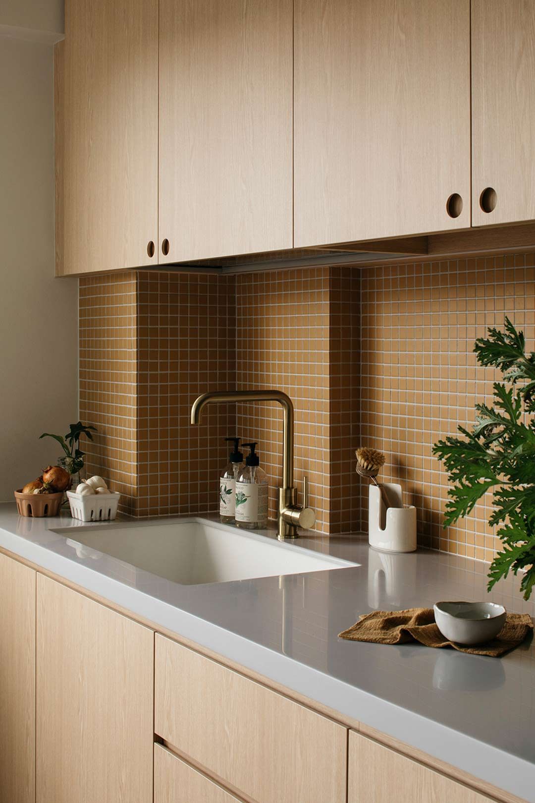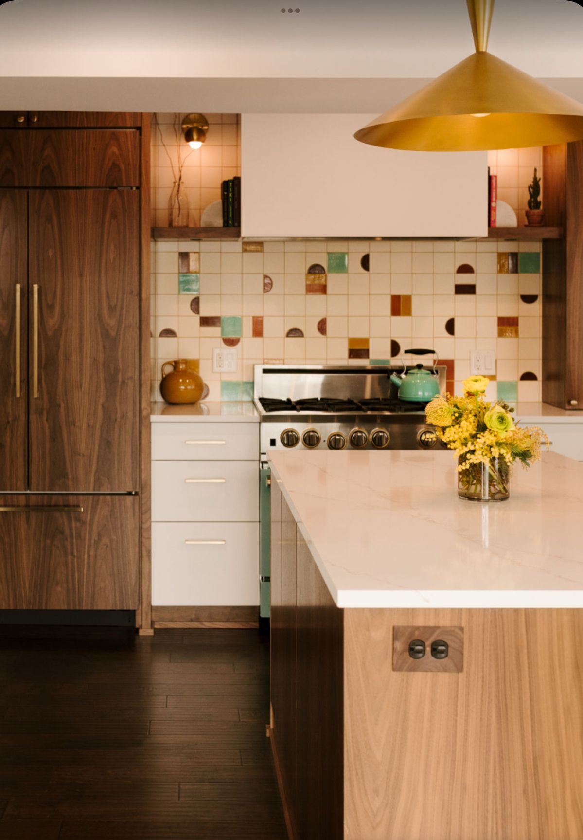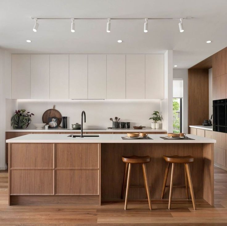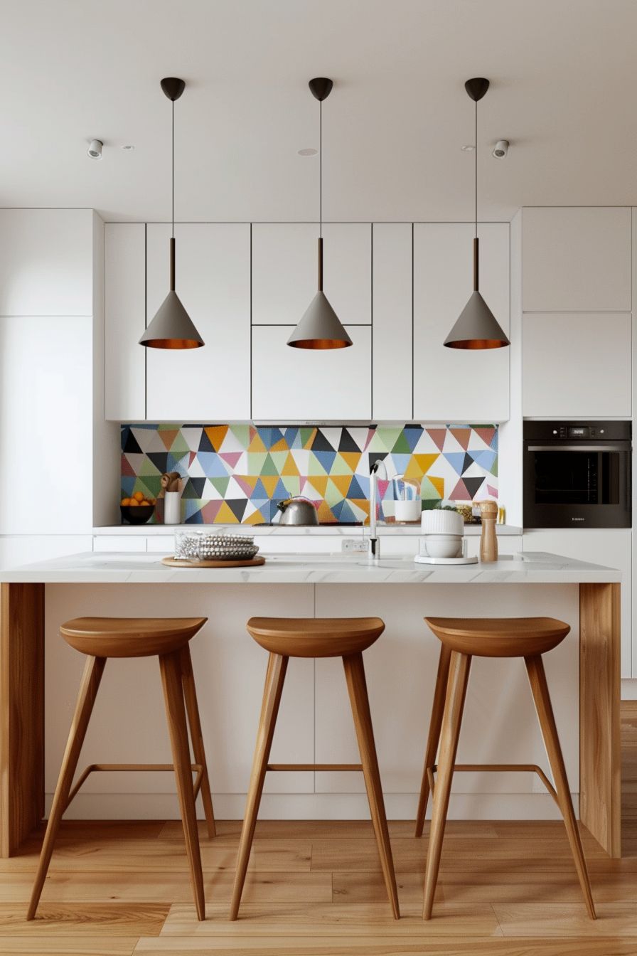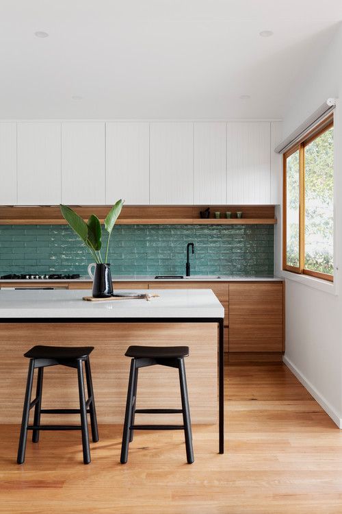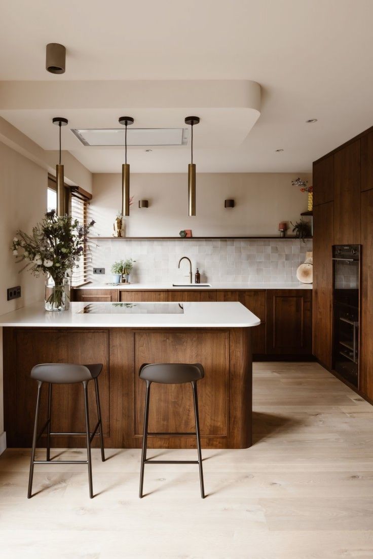 การตกแต่งด้วยสีโทนธรรมชาติ (Earthy Tones) เลือกใช้ไม้โทนสีเข้มอย่าง Teak หรือ Walnut สไตล์ Mid-Century สำหรับหน้าบานตู้ครัว ช่วยเพิ่มบรรยากาศอบอุ่น และจะเกิดความคอนทราสต์ที่ดูสะอาดตายิ่งขึ้นเมื่อนำมาจับคู่กับท็อปเคาน์เตอร์สีขาวนวลหรือเทาอ่อน พร้อมเพิ่มลูกเล่นด้วยกระเบื้องผนัง (Backsplash) ลายเรขาคณิตหรือสีสันที่ดูสนุกสนานเพียงเล็กน้อย ที่สร้างความโดดเด่นเป็นเอกลักษณ์