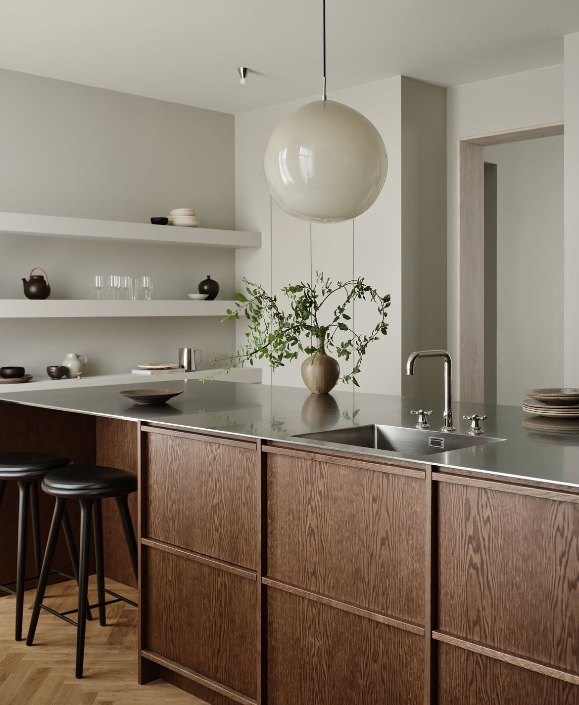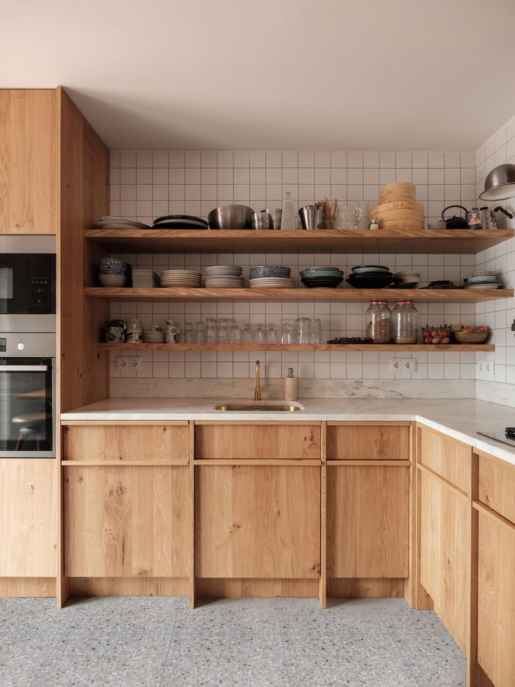 การวางโชว์ชุดเครื่องครัวบนชั้นวางไม้ ถือเป็นการสร้าง Storytelling ให้กับครัวสไตล์ Mid-Century และยังช่วยให้หยิบใช้งานสะดวกสบาย ตอบโจทย์วิถีชีวิตครัวไทยยุคใหม่ที่ต้องการความรวดเร็วมากขึ้น